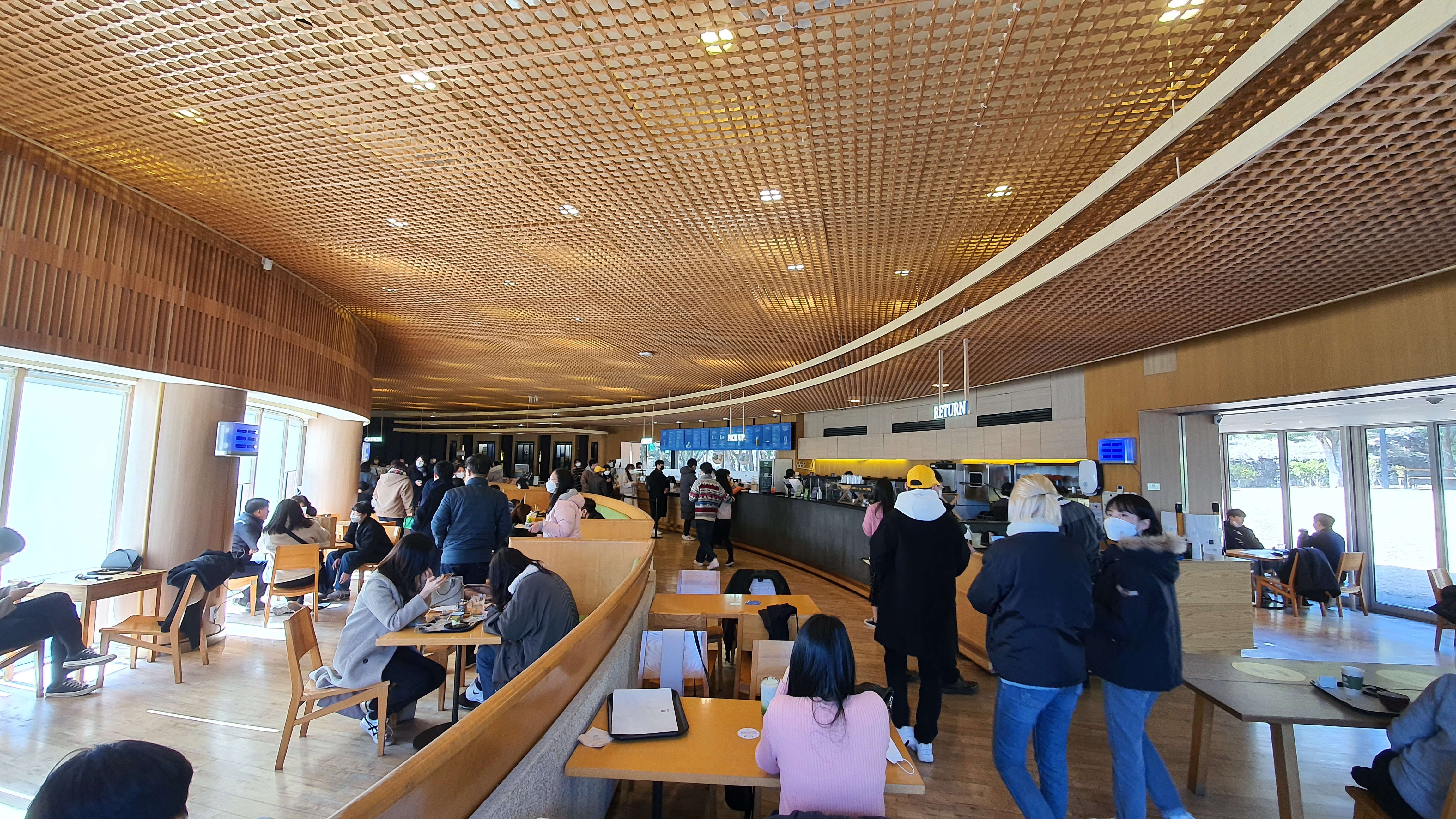 천장을 감싸는 목재마감으로 인한 따듯함이 느껴지는 건축물 이였습니다.