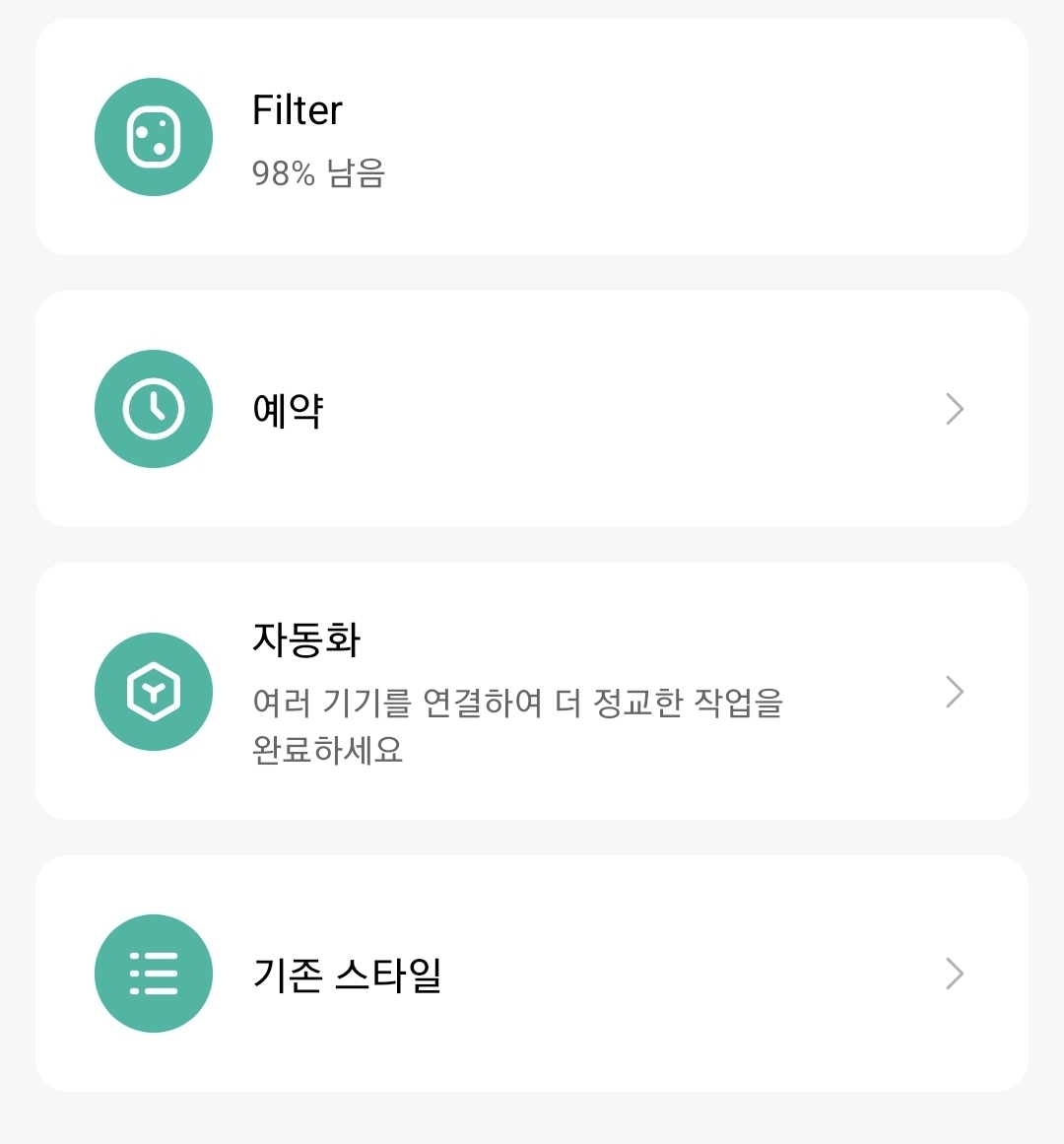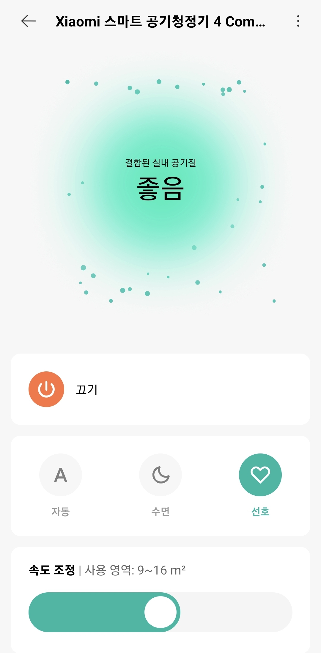 공기청정기 자체만으로는 최대, 절전, 자동 모드로 3가지만 가능하고 출력은 최대와 최소만 가능하여 불편합니다.